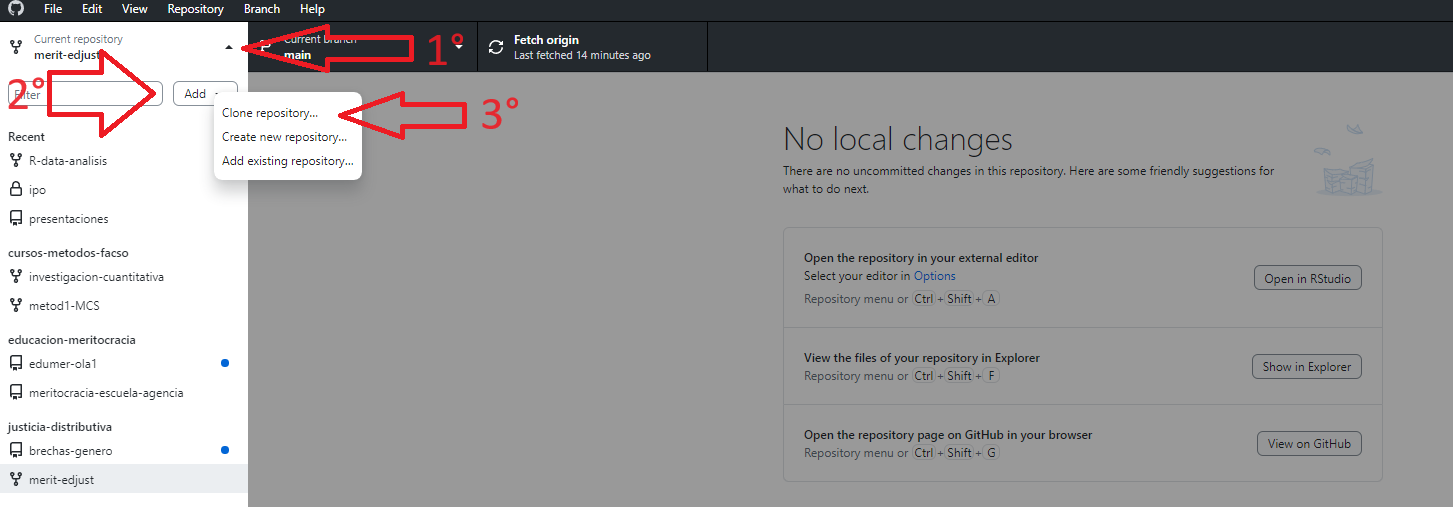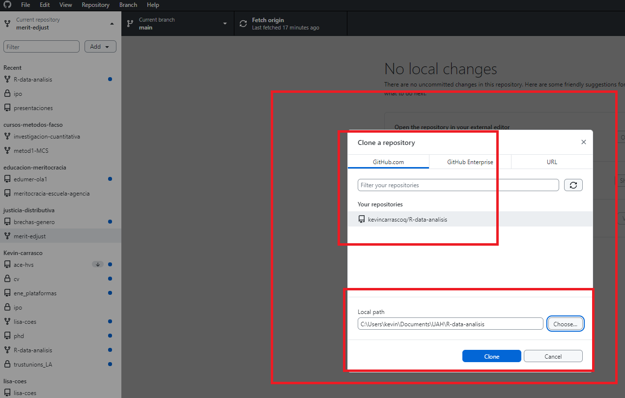 Una vez creado un repositorio, lo que nos interesa es descargarlo. Al abrir la aplicación de Github desktop por primera vez (descargada anteriormente), nos debería aparecer la opción de clonar nuestro repositorio R-data-analisis en la pantalla de inicio. Lo clonamos y seleccionamos una carpeta de nuestro computador para almacenarlo.
