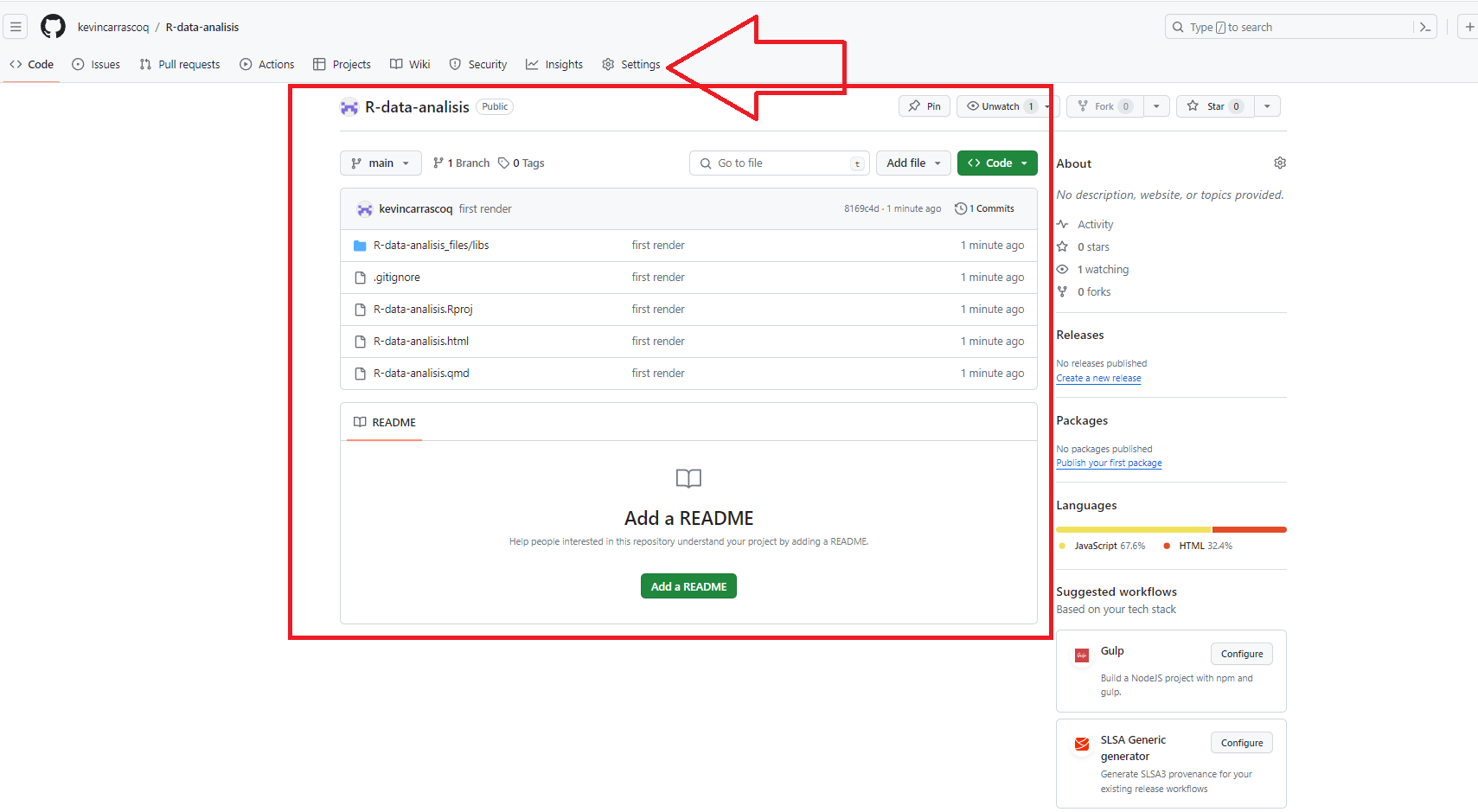 Luego de aproximadamente un minuto se actualiza la página y aparecerá un link en la parte superior, algo así como kevin-carrasco.github.io/ipo que es nuestra página principal de nuestro sitio web de github.