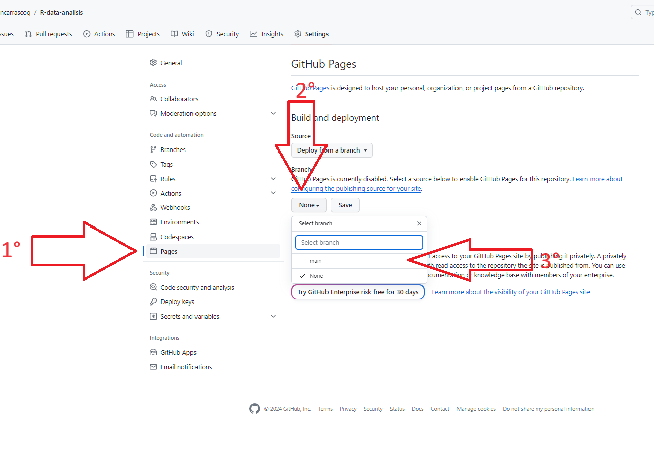 - Dentro de Settings vamos a Pages, luego ‘none’ y seleccionamos ‘main’. Luego apretamos Save