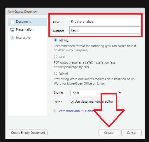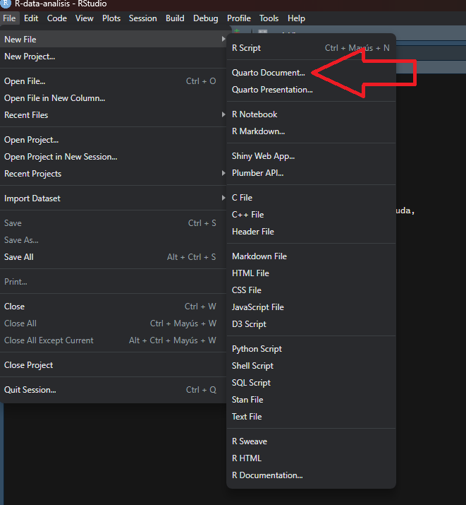 - Abrimos nuestro Rproject y creamos un nuevo documento de Quarto file –> new file –> Quarto document