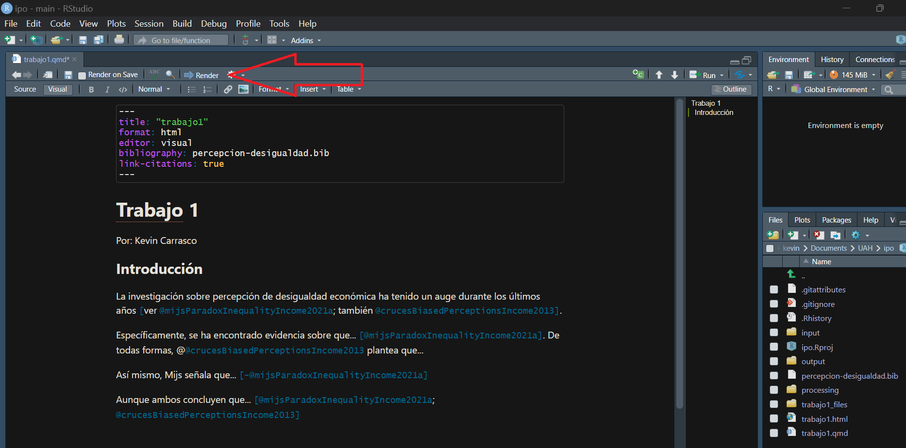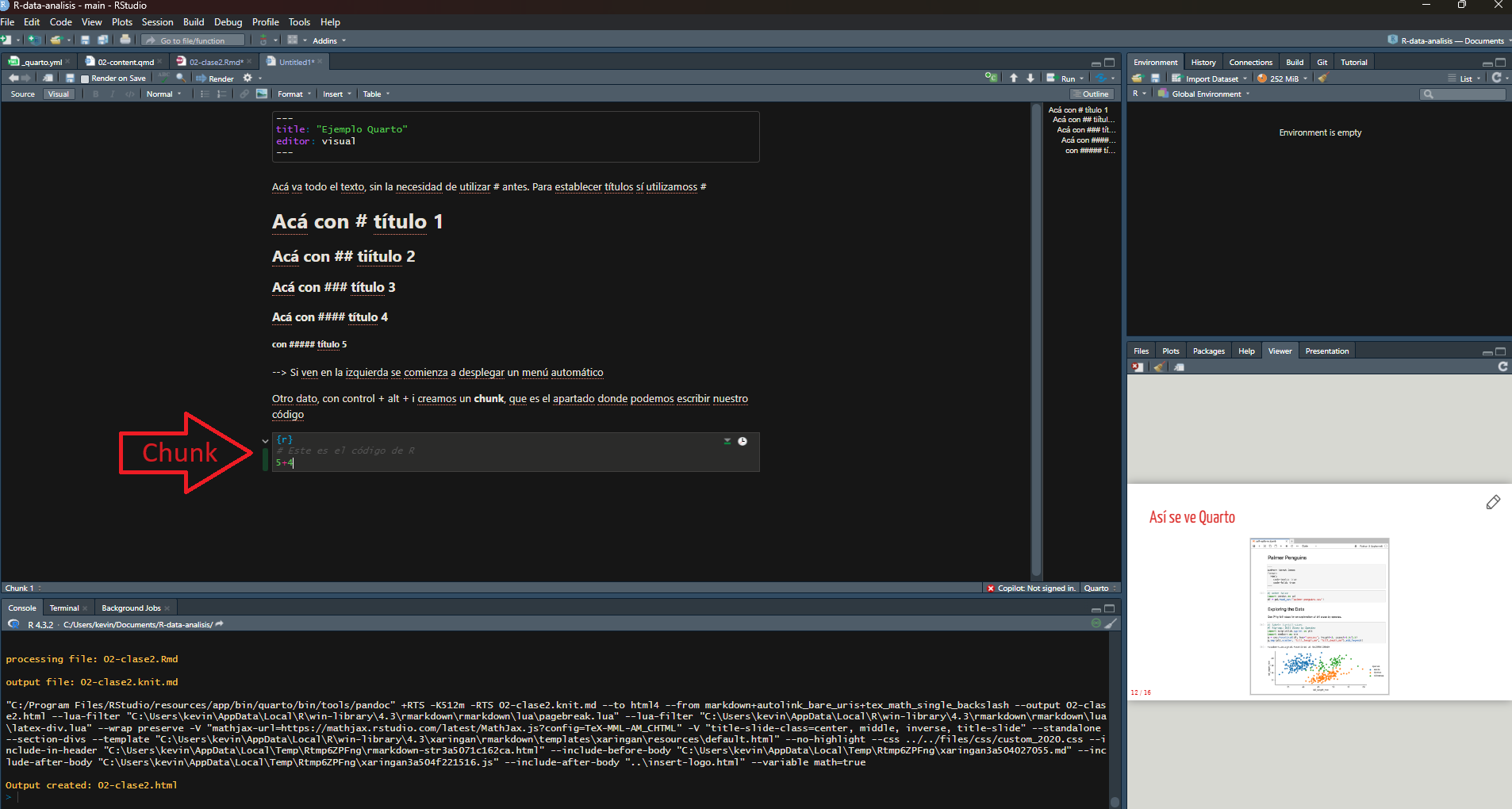A continuación, en esta guía combinaremos el paso-a-paso de crear un documento dinámico con quarto, a la vez que vamos viendo distintas funciones de este proceso.