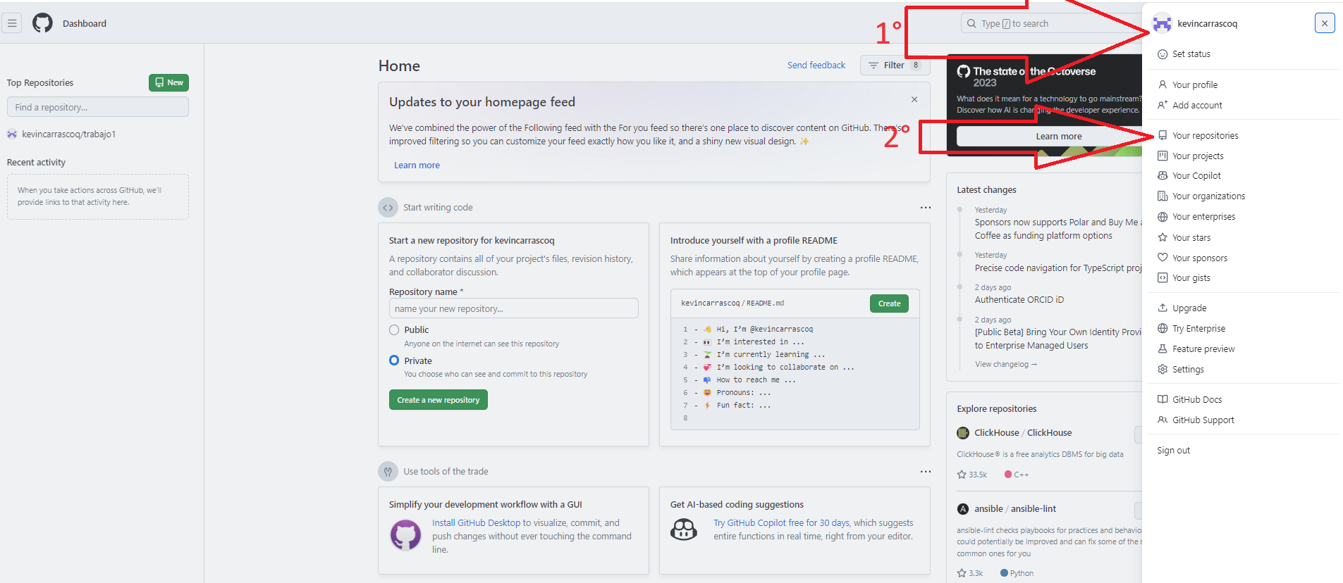 En la página principal de github hacer click en el ícono de usuario de la esquina superior derecha y luego ir a Tus repositorios