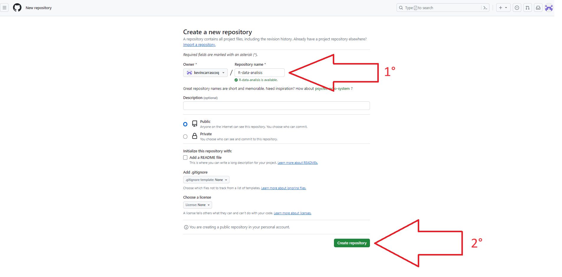 Luego le ponemos un nombre a nuestro repositorio, evitando siempre espacios, ñ y tíldes, y apretamos Crear repositorio