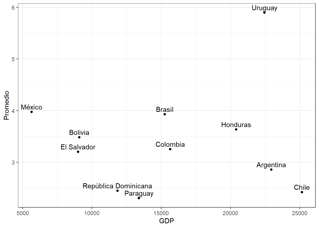 La Figure 3 muestra la relación que existe entre el producto interno bruto y la confianza en instituciones para los 18 países analizados. Es interesante comparar los casos de Chile y urugay, que al tener similar GDP, tienen un nivel de confianza en instituciones muy diferente.